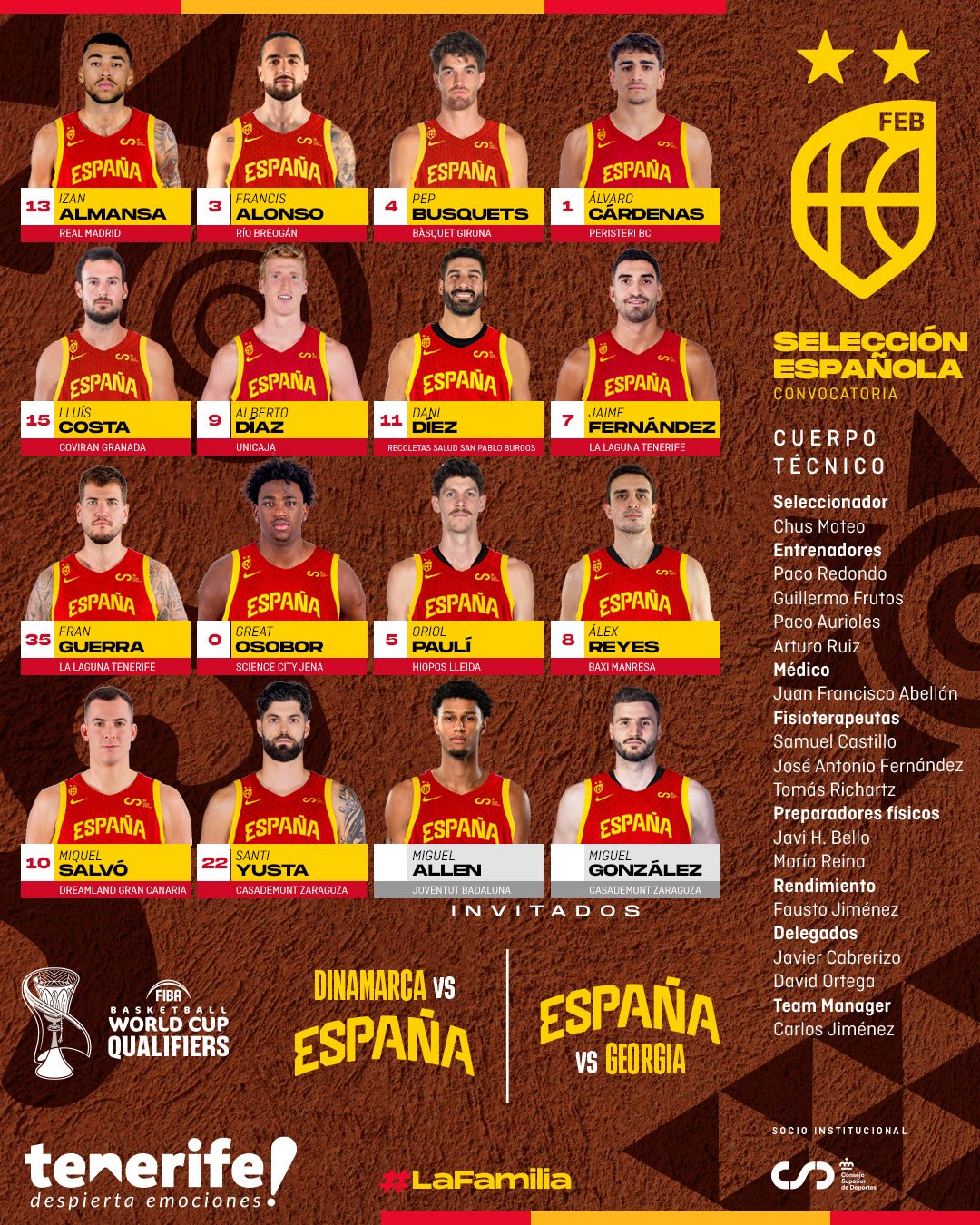 La primera lista de España para la próxima ventana Fiba ya está anunciada por el nuevo seleccionador masculino, Chus Mateo. Los primeros encuentros en la agenda son el día 27 en Copenhague contra Dinamarca mientras que el 30 jugará ante Georgia en Tenerife. Comienza la clasificación para la Copa del Mundo 2027 y Ucrania es el otro rival de la selección española. Como no se para la Euroliga, Mateo no podía convocar a jugadores que disputan esa competición, es decir, que salvo que fuera permitido por sus clubs expresamente, los internacionales del Barcelona, Real Madrid, Baskonia y Valencia Basket, además de Juancho Hernangómez (Panathinaikos), no han sido llamados. Lo mismo con la NBA (Santi Aldama, Hugo González y Eli Ndiaye).