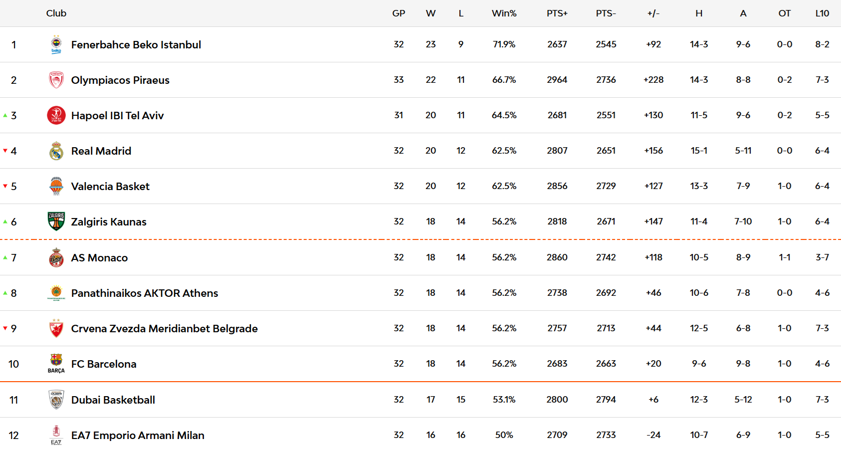 La clasificación no sufre alteraciones relevantes esta semana pero la zona que va entre el tercer clasificado y el décimo sigue apretadísima con las derrotas del Valencia Basket y el Real Madrid y sacan partido de ellas el Barcelona y el Zalgiris. También el Panathinaikos con su triunfo frente al Estrella Roja de este viernes y el Dubai BC sigue aspirando al play-in con el suyo.