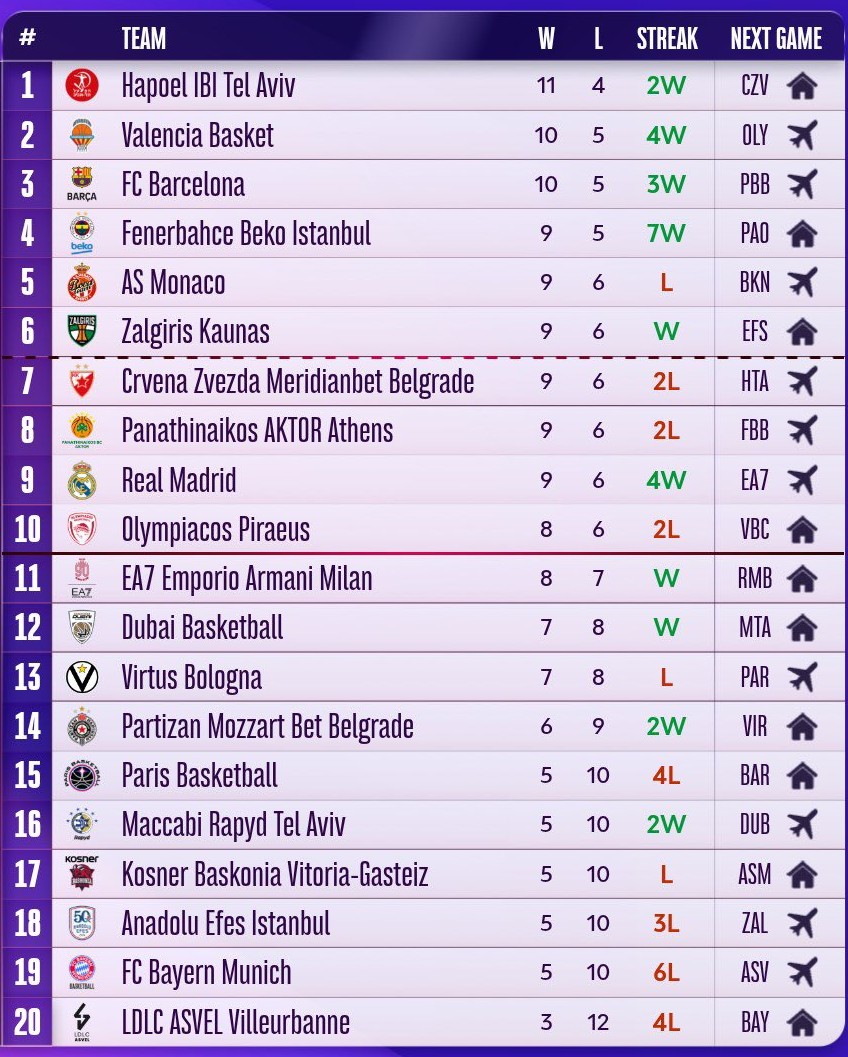 Quince jornadas de la Euroliga disputadas y la clasificación se mueve poco en cuanto a los diez primeros clasificados, que claramente marcan distancias con los ocho últimos. Quedan en el medio de ambos grupos el Armani Milán y el Dubai, con pinta de poder aspirar al play-in pero sin la solidez suficiente para meterse más arriba.