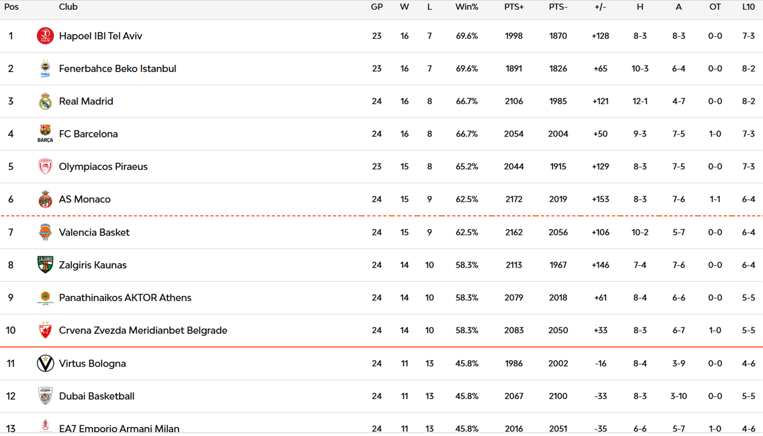 La clasificación de la Euroliga sufre pocos movimientos más allá de descolgarse un poco algún equipo aspirante al play-in. Arriba, el batacazo del Hapoel en Belgrado no les afecta mucho pero les quita su ventaja. Gran semana del Real Madrid, el Barcelona, el Olympiacos y el Fenerbahce, que sumaron dos triunfos.