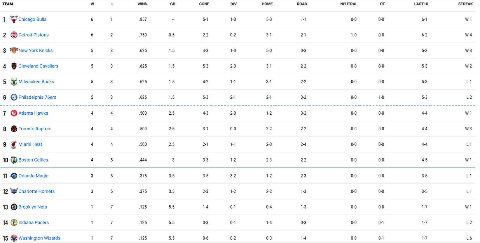 La cara contraria, los dos equipos de Florida. Se esperaban más victorias de Orlando Magic y Miami Heat, aunque hay que destacar que han jugado más partidos fuera de casa que como locales. En la zona media de la tabla están los Raptors y los Hawks, buen inicio para los de Toronto mientras que del equipo de Atlanta se espera que esté peleando por el playoff.