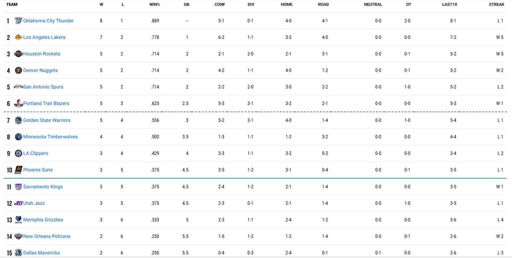En el Oeste domina de momento el vigente campeón, Oklahoma City Thunder, que arrancó como un tiro con balance de 8-0 y sumó este miércoles su primera derrota. Su larga rotación marca diferencias, también el hecho de mantener a sus diez jugadores principales, que se conocen muy bien y, cómo no, el liderazgo de su MVP, Shai Gilgeous-Alexander, que está promediando 33,3 puntos, a dos décimas del mejor promedio anotador de momento, Tyrese Masey.