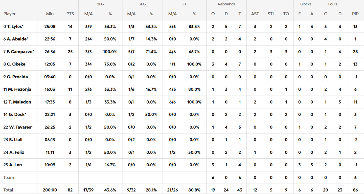 Okeke, de nuevo, máximo reboteador. Por su parte Abalde demuestra una vez más que para él meter un T3 no es igual en el primer cuarto que en el último. Si hay presión el gallego o bien se desentiende, o bien falla. Claramente no es jugador para darle la bola cuando quema. Hezonja tuvo la noche que siempre le llega después de una buena racha. Exceso de confianza e individualismo.Seguira siempre dándole trabajo al equipo técnico. Tavares otro de esos partidos que no mira al aro. 2 puntos en 26 minutos.