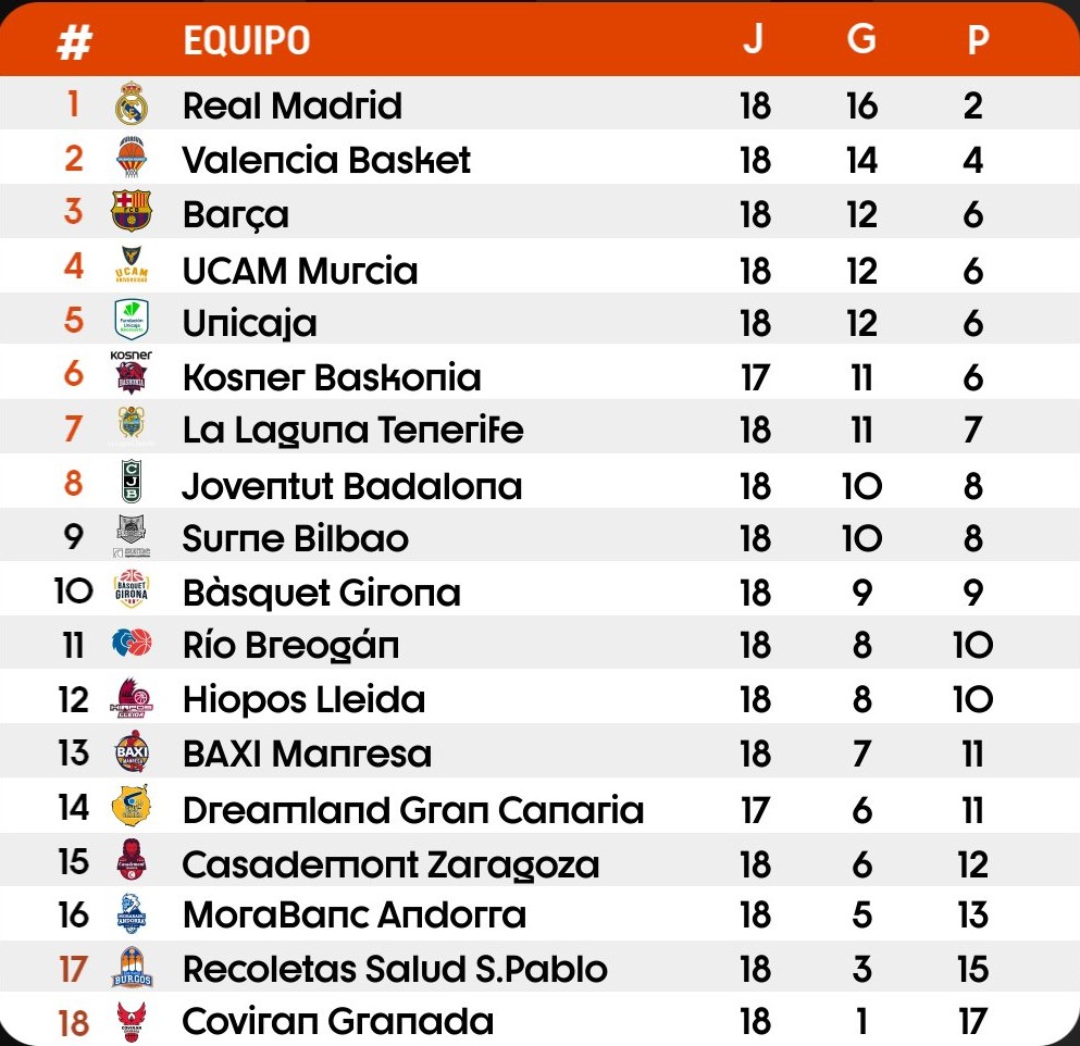 Van pasando los jornadas y parece claro que todos los de arriba y que entraron en la Copa del Rey siguen fuertes, aun perdiendo partidos como esta semana el Barça y el Baskonia, pero los demás no aprietan. El Joventut parece el más endeble y el que se va a disputar la última plaza de playoff en lucha con el Bilbao Basket y el Girona.
