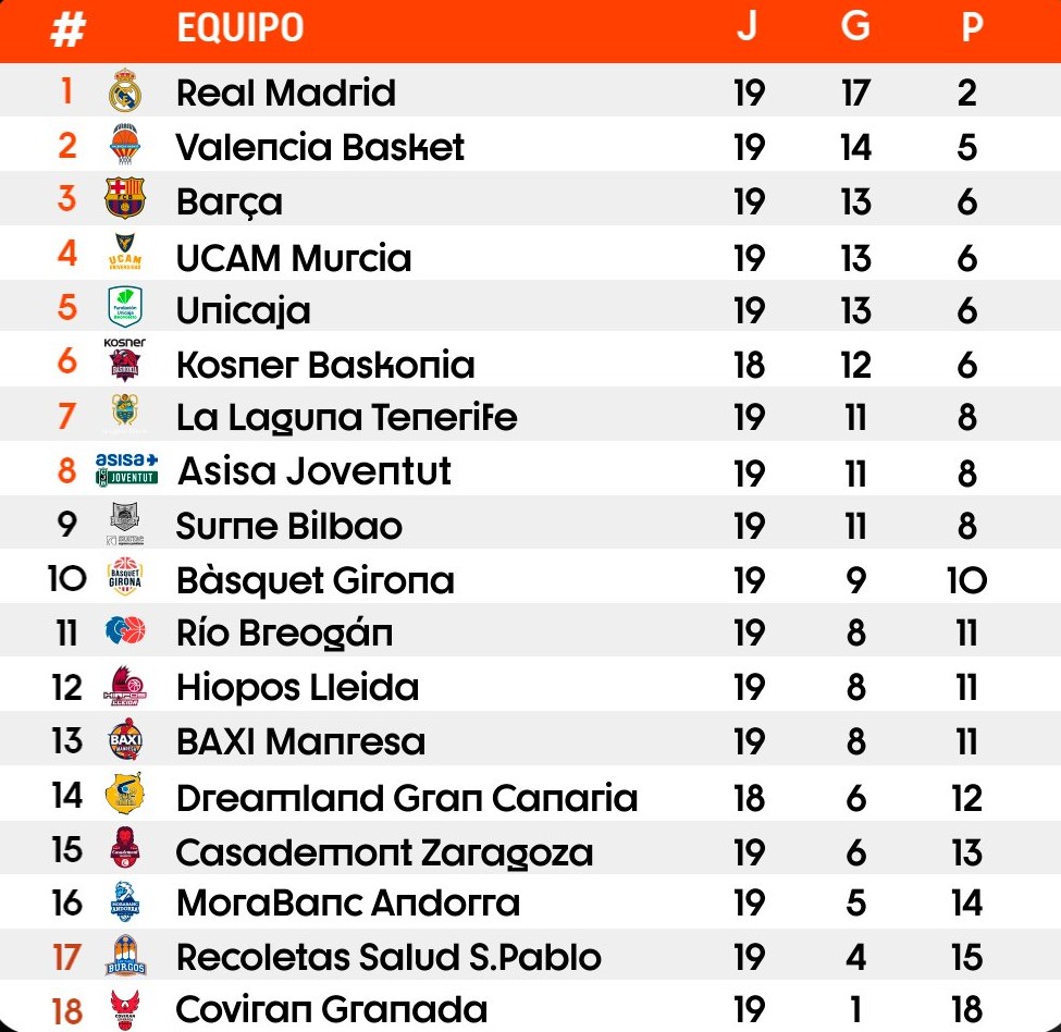 A nivel de equipos, mirando la clasificación, aparte de destacar una semana más al UCAM Murcia, hay que subrayar la línea del Bilbao Basket, que acumula seis triunfos consecutivos.