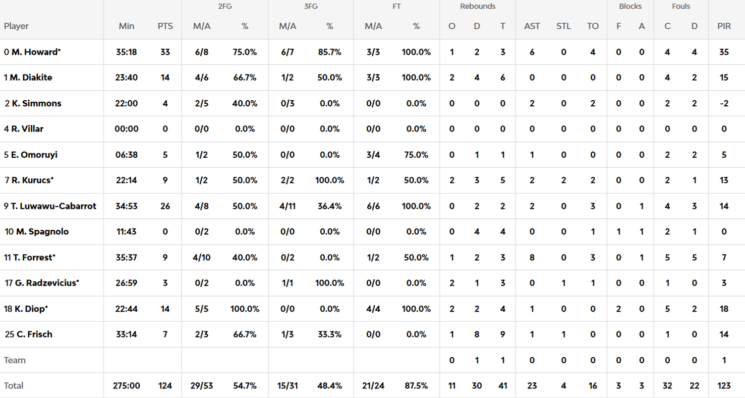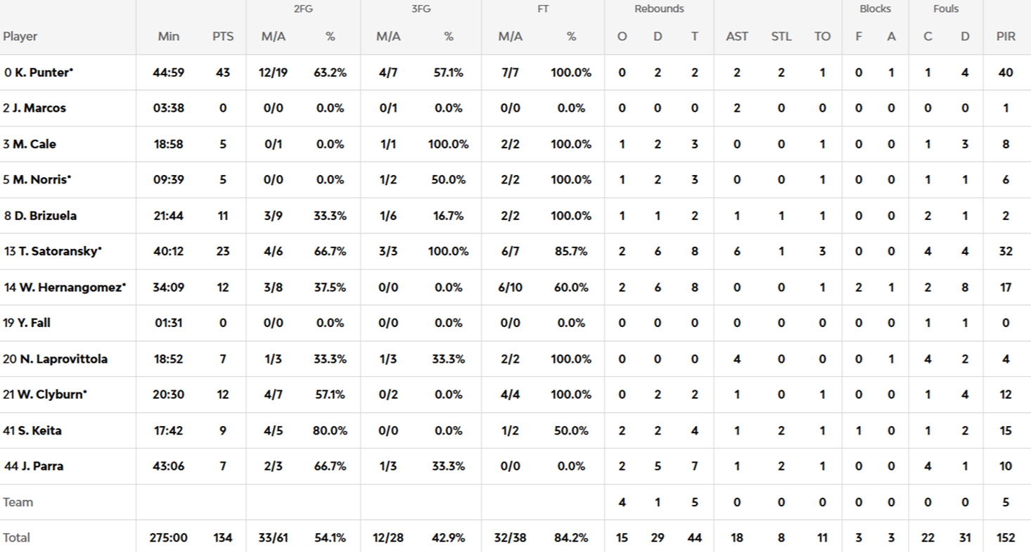 El Barcelona se llevó un duelo que entra ya directamente en los anales del baloncesto europeo. Tres prórrogas, una emoción indescriptible y alguien tenía que ganar. Cayó del lado azulgrana como pudo hacerlo en favor del Baskonia, que no supo asegurar el triunfo en la segunda prórroga. Los 43 puntos de Kevin Punter pasan asimismo a ser una de las mayores exhibiciones en estos 25 años de historia de la Euroliga. 40 de valoración hizo el escolta y 32 Satoransky con su 23+8+6, ambos jugando más de cuarenta minutos. 33 anotó Markus Howard para el conjunto vitoriano con un 12 de 15 impresionante en su serie de tiro.
