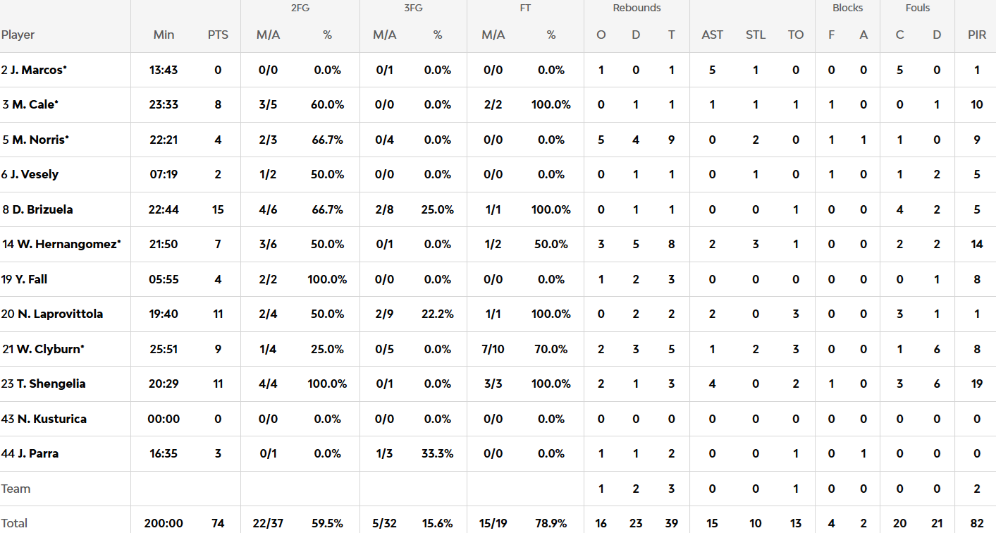 Opino lo mismo.Malas rotaciones,sobre todo en el tercer cuarto.Fall,que no lo estaba haciendo mal,tenìa que haber jugado más minutos.Los minutos que juega Willy,se los darìa a Fall.Cada vez que juega Willy,nos meten un parcial de 8,10, o 12 puntos en contra.Cale,tampoco estaba jugando nada mal y creo que hoy,merecìa más minutos….