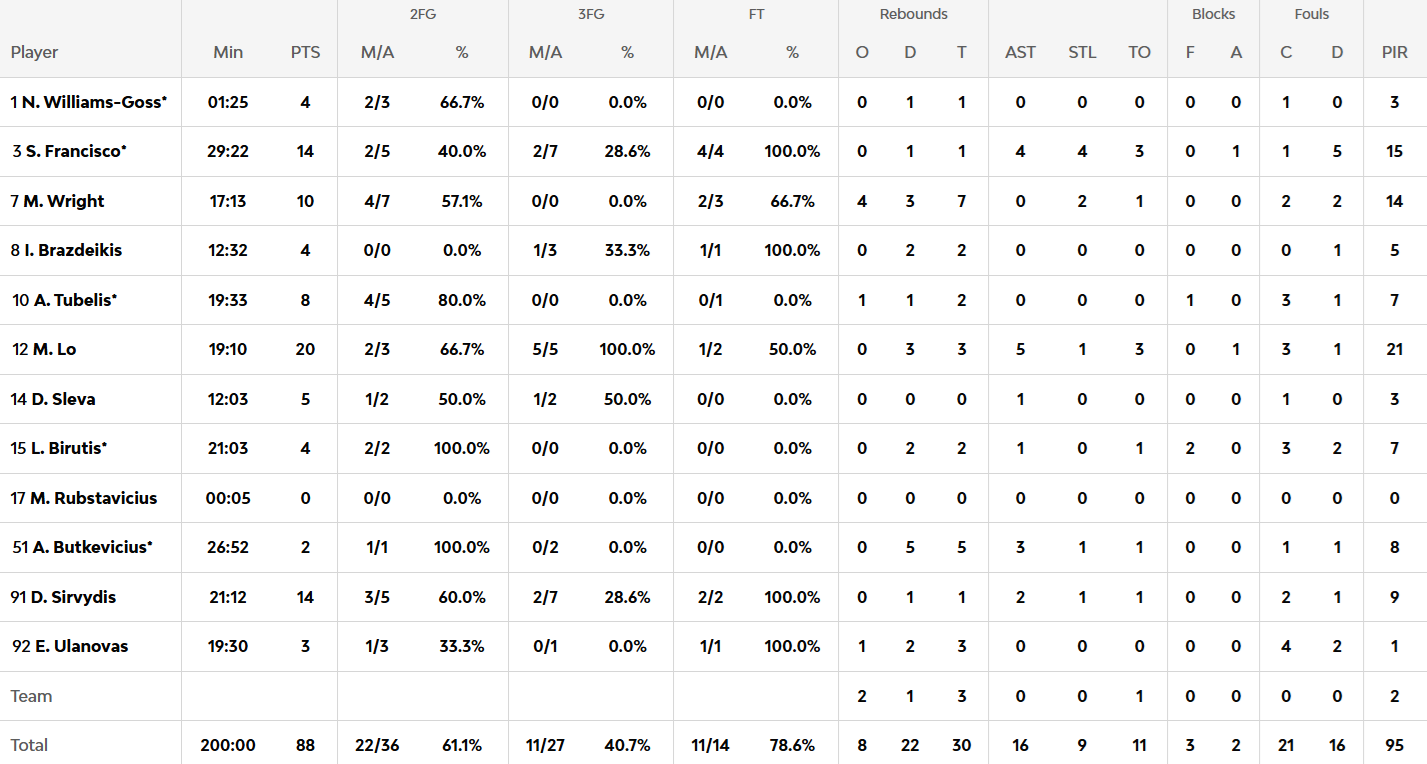 Señor equipo Zalguiris. A los fundamentos, a las buenas defensas, la buena mano, la inteligencia,.. Añaden un trio de combos, de bases-escoltas, como los llamen, que son diablos, William-Goss hoy jugó poco, pero vaya 3. Y lo apuntalan con lo necesario para ser un equipo competitivo hoy en día, un 5 físico, con salto y movilidad, que nosotros no buscamos porque somos más listos que el resto. Muy buena pinta tienen.