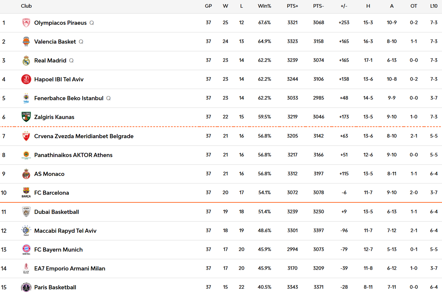 El partido aplazado en su día en febrero por la guerra entre los dos equipos israelíes se disputó este domingo. Lo ganó el Hapoel Tel Aviv en el exilio de Belgrado al Maccabi por 77-99. Esto hace que el Hapoel se coloque con 23 triunfos en la tabla a falta de una jornada y que aseguren un puesto de playoff esquivando el play-in. También suman 23 tanto el Real Madrid como el Fenerbahce. Con 22 se queda el Zalgiris como sexto clasificado.