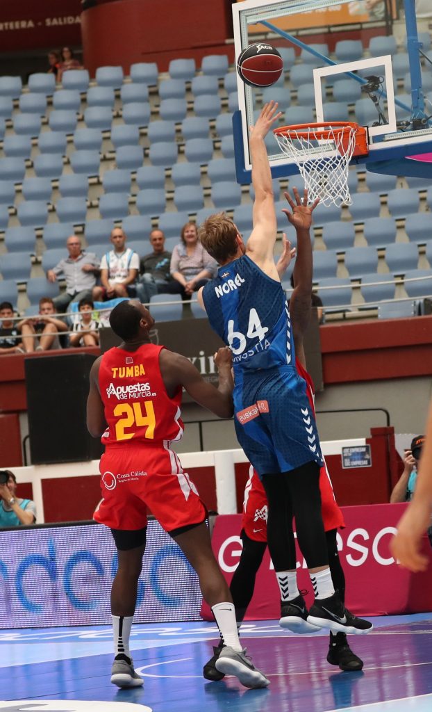 Pocos puntos de inicio en Illumbe con un 11-7 para los donostiarras frente al equipo murciano en el minuto 8. Pero empezó a ver aro el equipo local y se escapó a un 28-16 en el 15. Buena reacción visitante (30-25) y un triplazo sobre la bocina del descanso del holandés Kloof colocó el 32-31. Las 10 pérdidas que llevaban los de Porfi Fisac hacían daño mientras que el UCAM había metido ya seis triples.