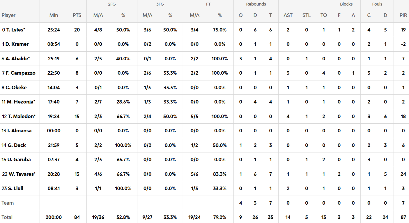 28 minutos de Tavares. Lyles y Abalde 25 minutos. Las sensaciones son muy malas. Facu muy superado, hoy le han flotado descaradamente, 4 perdidas y 2/6 en tiro de 3. Mario haciendo la guerra por su cuenta.