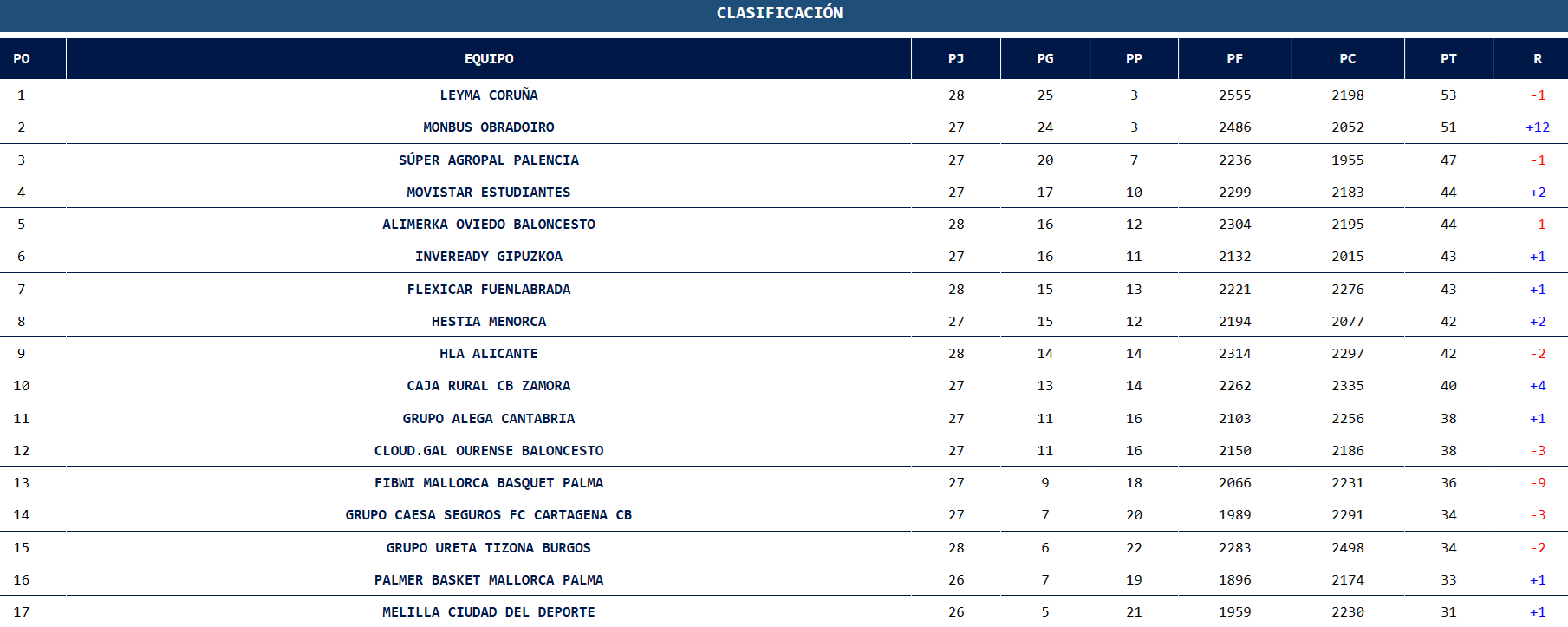 Por detrás, sigue tercero el Palencia, que fue el equipo que descansó esta semana. Cuarto es Estudiantes tras ganar cómodamente en Burgos (76-96) con un parcial de 31-58 en la segunda mitad.