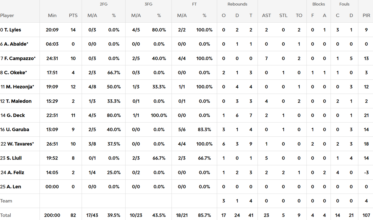 Lyles 14 puntos, 4/5 T3 y 0/3 T2, 2 rebotes y 2 asistencias y 2 perdidas, 9 valoración