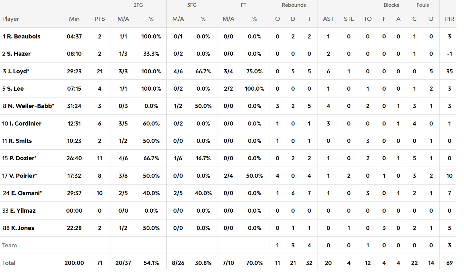 Primera unidad Tavares 10 puntos y 9 rebotes (18 valoración=, Facu 10 puntos (0/3 T2 y 2/5 T3) y 7 asistencias