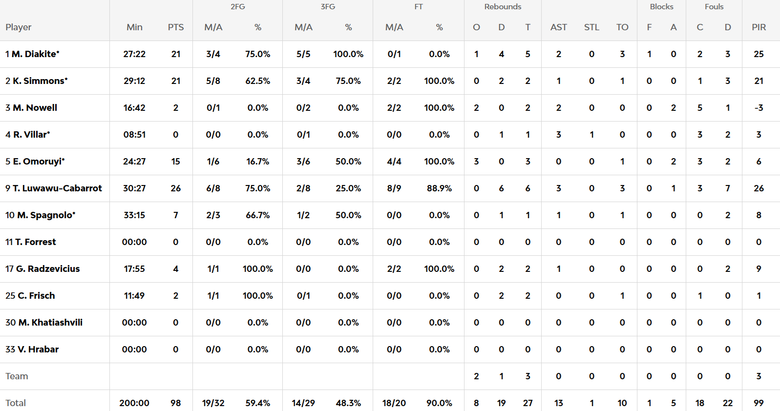El Baskonia ganó y tuvo un meritazo aún más grande que en la Copa del Rey pues Forrest fue reservado por precaución y tampoco estaban ni Howard ni Kurucks, que sí disputaron la final copera frente al Real Madrid. Es decir, Scariolo no ha aprendido nada de esa derrota y sus jugadores no supieron escapar de los errores de su entrenador. La victoria les permitía tener casi atado el factor cancha, depender de sí mismos, hasta poder elegir rival en playoffs y escapar del play-in. Pues no, derrota en Vitoria y con sensación de que no sabían cómo defender a un rival que les castigó en el último periodo con su conocida receta de jugar sin interiores porque sólo tienen ahí a Diakite, a tirar de tres, cinco jugadores abiertos… Además, el Madrid ganaba por siete a falta de dos minutos y se hundió. Un desastre total. Ellos reservaron a Lyles por molestias en un tobillo. Destacaron brutalmente Diakite, Simmons y Luwawu-Cabarrot en el bando baskonista.