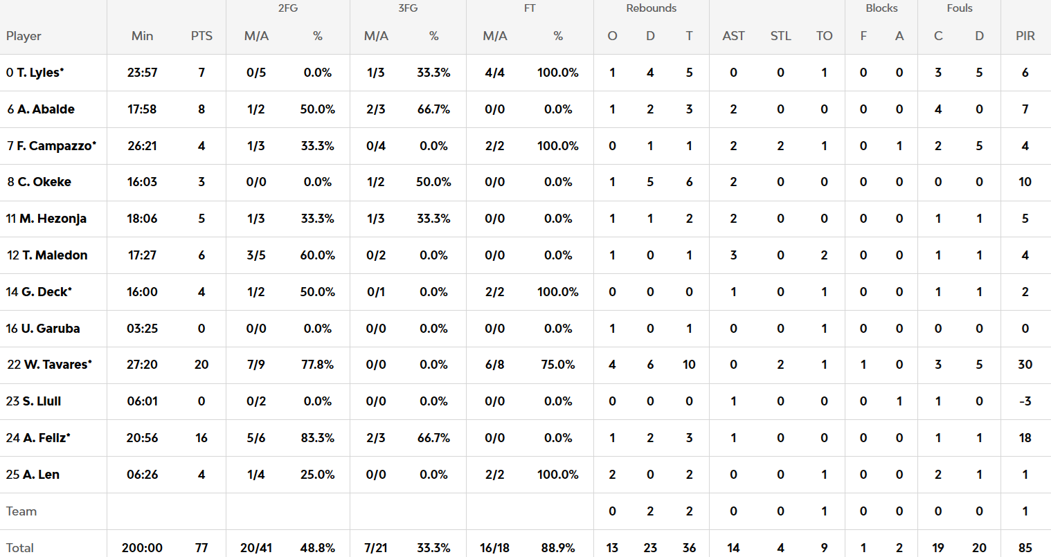 De los grandes bien Tavares, Len hoy perdido (normal) y Garuba buena intensidad no premiada. Hezonja más centrado pero intrascendente. Deck horroroso. Lyles no ha tenido el día, aunque venía de partidos muy buenos, y Okeke es en potencia un gran gregario, pero no parece un líder para partidos de este tipo.