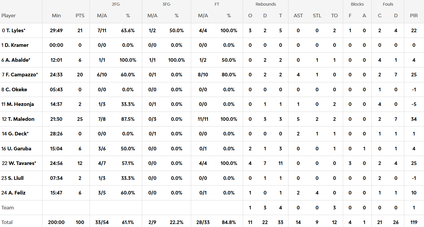 Vaya partidazo! Llegar a 100 puntos metiendo solo 2 T3 creo que demuestra muy claramente cuáles son los puntos fuertes de este equipo. Penetrar y tirar o doblar a los pívots. Maledon es claramente el heredero de Musa en cuanto a penetración y seguridad en los tiros libres. Campazzo al fin hizo un buen partido, aunque le sobraron varias filigranas absurdas que no generan ninguna ventaja estuvo muy bien en ataque, aunque sigue sin ayudar mucho en defensa. En ese menester también quedó retratado Lyles, al que buscaban constantemente los jugadores de Zalguiris, con especial fruición Tubelis.