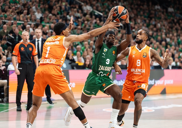 Un 18-17 en el primer parcial e igual de parejo fue el segundo cuarto, donde el Zalgiris aprovechó un parcial de 9-2 para abrir hueco. Sleva castigó con acierto exterior, mientras que el Valencia se apoyaba en acciones puntuales de Taylor y Montero para resistir. Un intercambio final de triples entre Costello y Maodo Lo dejó el marcador en 38-35 al descanso.
