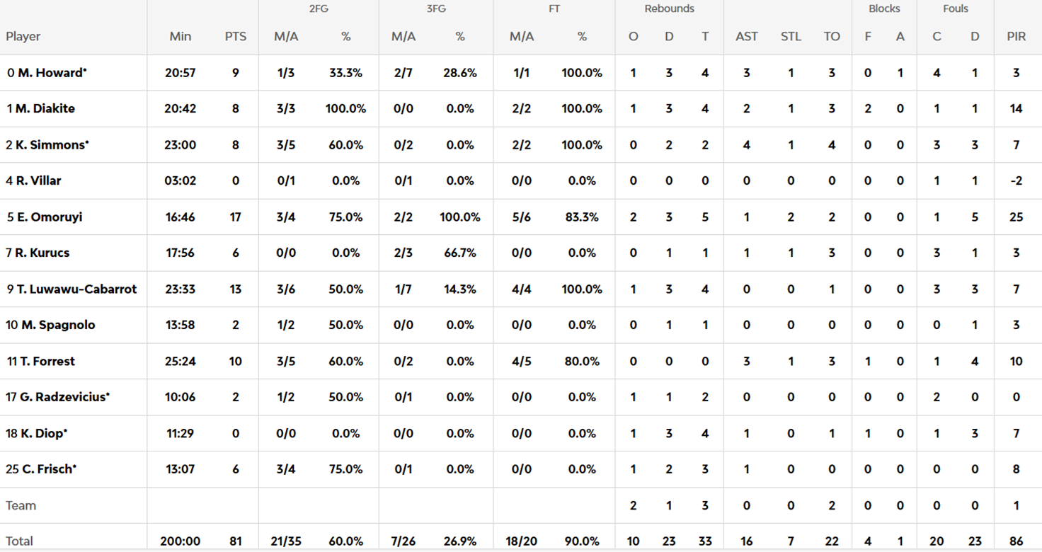El 58-47 al descanso se explicaba básicamente por el tremendo 11 de 15 en tiros de tres del conjunto taronja mientras estaban en un 7 de 16 en lanzamientos de dos puntos. En cambio, su rival firmaba un 3 de 13 desde el arco. Costello había destacado con 14 puntos por 13 de Luwawu-Cabarrot. Al principio, las ventajas del Valencia fueron pequeñas (22-19, min. 9), pero ahí comenzó un parcial hasta el 35-21 del minuto 12 que dejó sin ideas a los de Galbiati.
