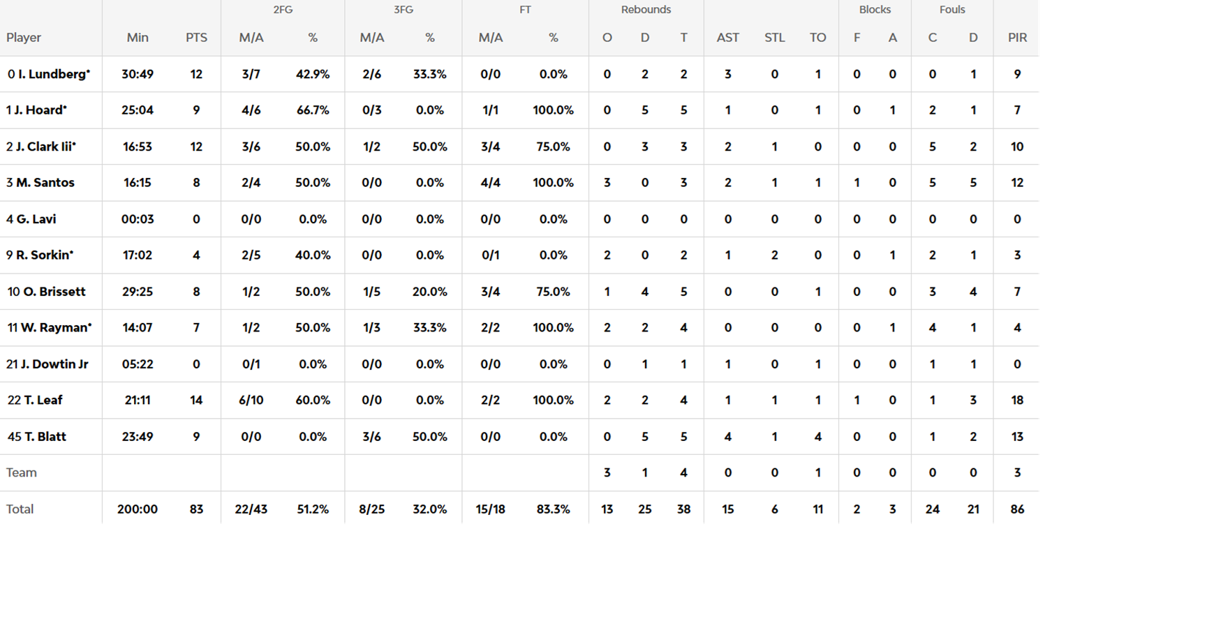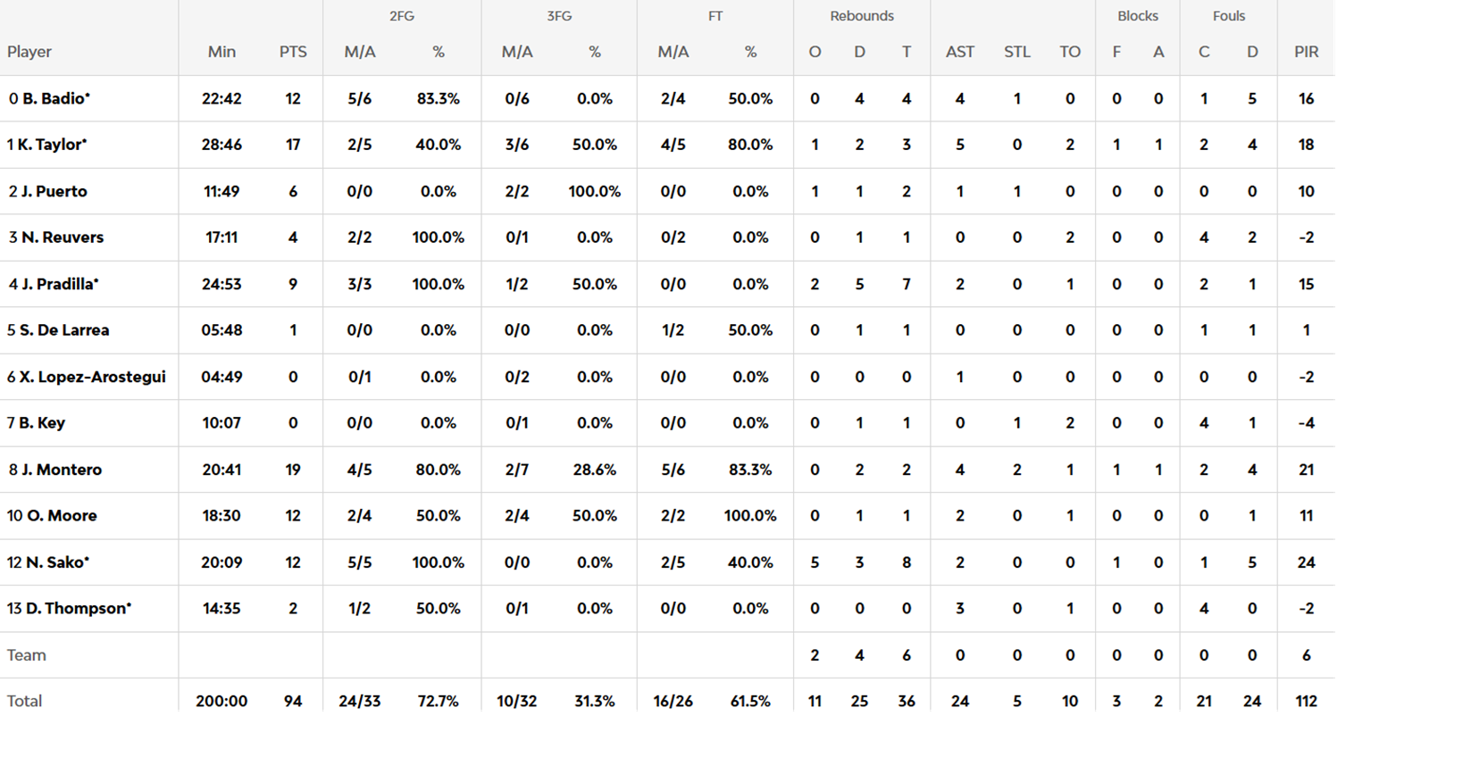 Ventajas visitantes desde el comienzo y un 21-27 al final del cuarto inicial, sin que hubiera funcionado Nate Reuvers en el juego interior. Por ello, Pedro Martínez movió varias piezas al empezar el segundo y sus pupilos se acercaron (25-27). La respuesta fue un triple frontal de Tamir Blatt, lo cual contagió a sus compañeros T.J. Leaf e Iffe Lundberg para ampliar la distancia nuevamente.