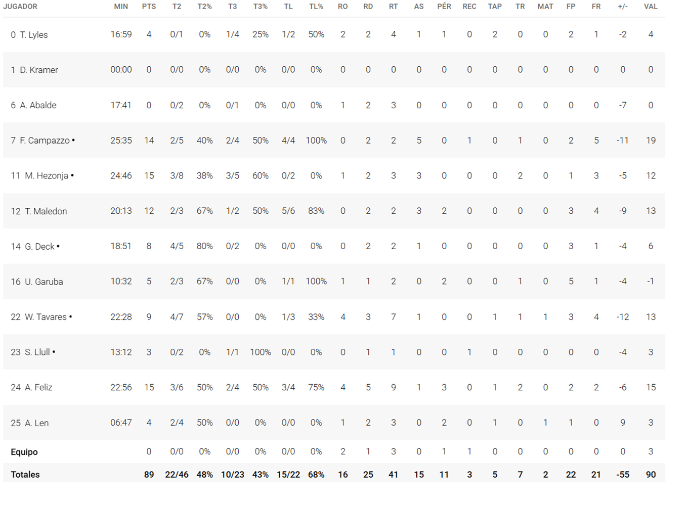 Lyles muy decepcionante todo el torneo. Garuba jugando sin cerebro y sin intensidad. Deck y Tavares agotados. Hezonja empezo demasiado revolucionado, aunque luego se serenó y rindió bien en ataque, pero flojo en defensa, como casi todos.