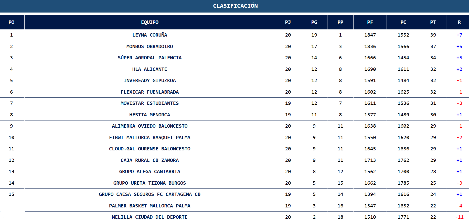 El conjunto coruñés mantiene dos triunfos de ventaja tras vencer al Basket Mallorca Palma por 65-85, mientras que el cuadro obradoirista se impuso en Melilla por 70-92. El Palencia también ganó a domicilio y se coloca tercero, 61-76 para ellos en Oviedo. El Alicante, a su vez, sumó fuera, 87-90 en Fuenlabrada. El 91-90 del Alega Cantabria frente al Gipuzkoa les permite alejarse ya mucho de la zona de descenso.